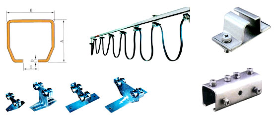 三、 滑线导轨主要技术数据: 1、 额定电压:AC750V以下。 2、 每芯导线材料和截面积:橡套扁平软电缆、多股铜芯线1.5-50mm2 3、 环境温度:-20°C~+90°C 4、 四轮台车运行速度:<90m/min 5、 四轮台车工作寿命:<3200h 6、 允许最大静负荷:150kg